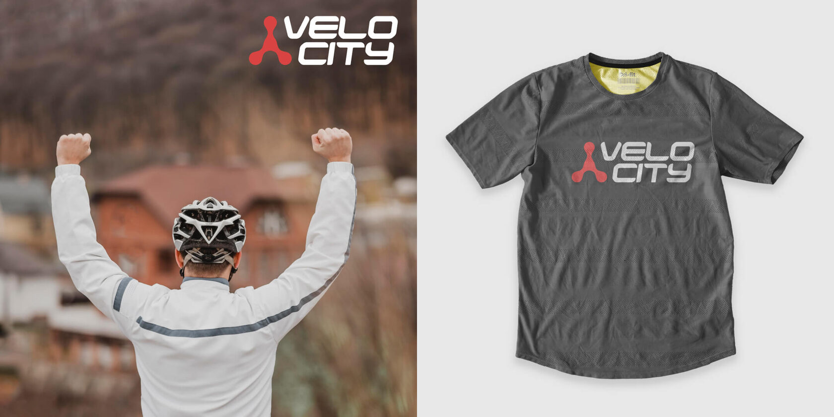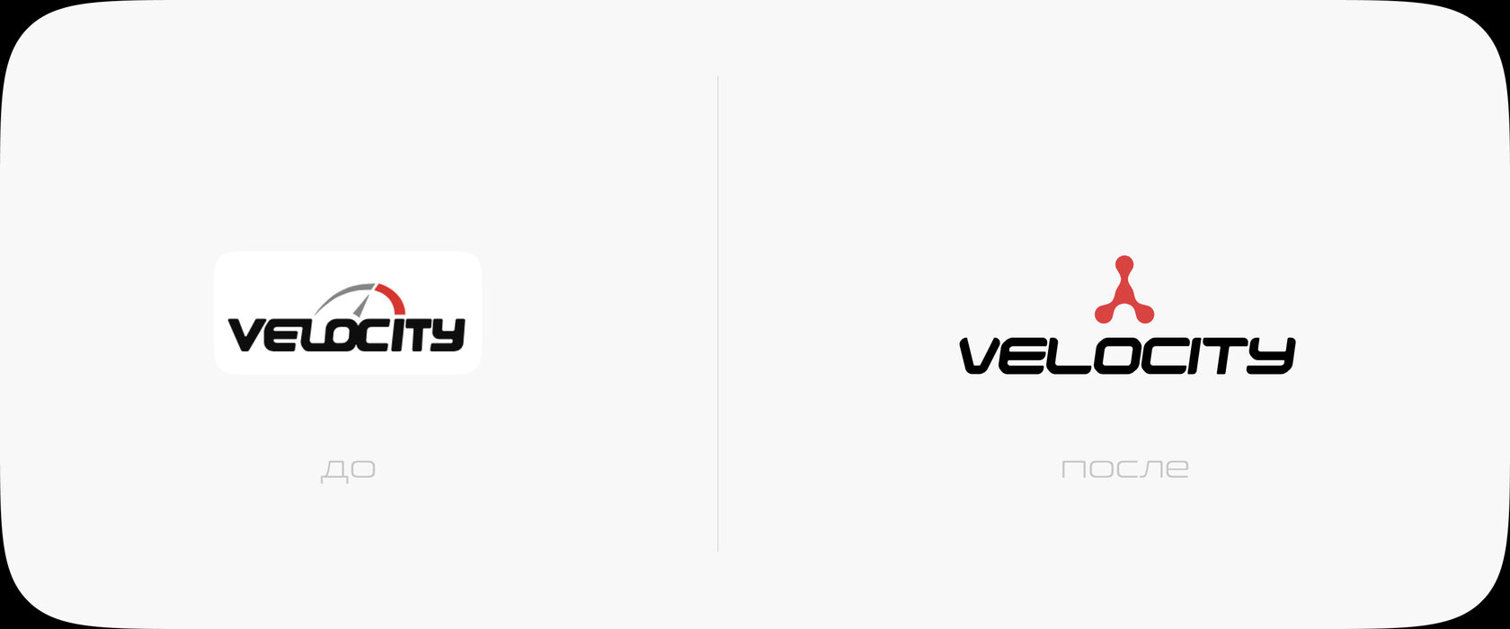 Velocity — онлайн магазин занимающийся продажей вело и мототехники. Дизайн логотипа символически изображает велосипедиста (или мотоциклиста). Шрифт был перерисован в более прямоугольном начертании.